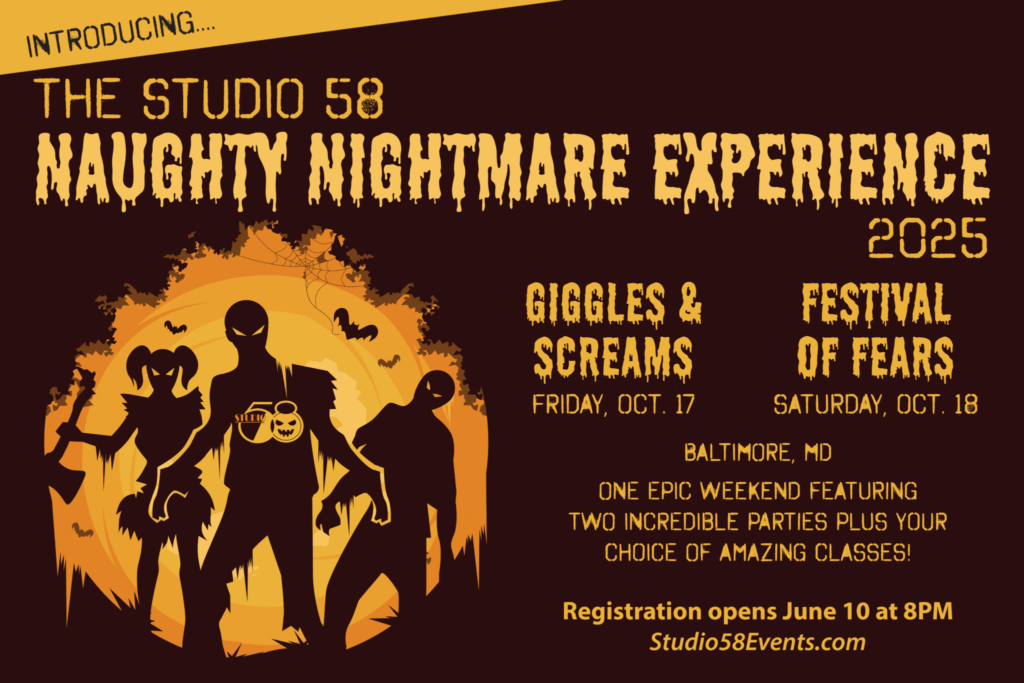 Pro tip: Treat your first Studio 58 weekend as a sampler—dip into classes, watch a dungeon scene, attend one or two theme parties, and focus on meeting people. You’ll leave with confidence (and friends) for your next event.